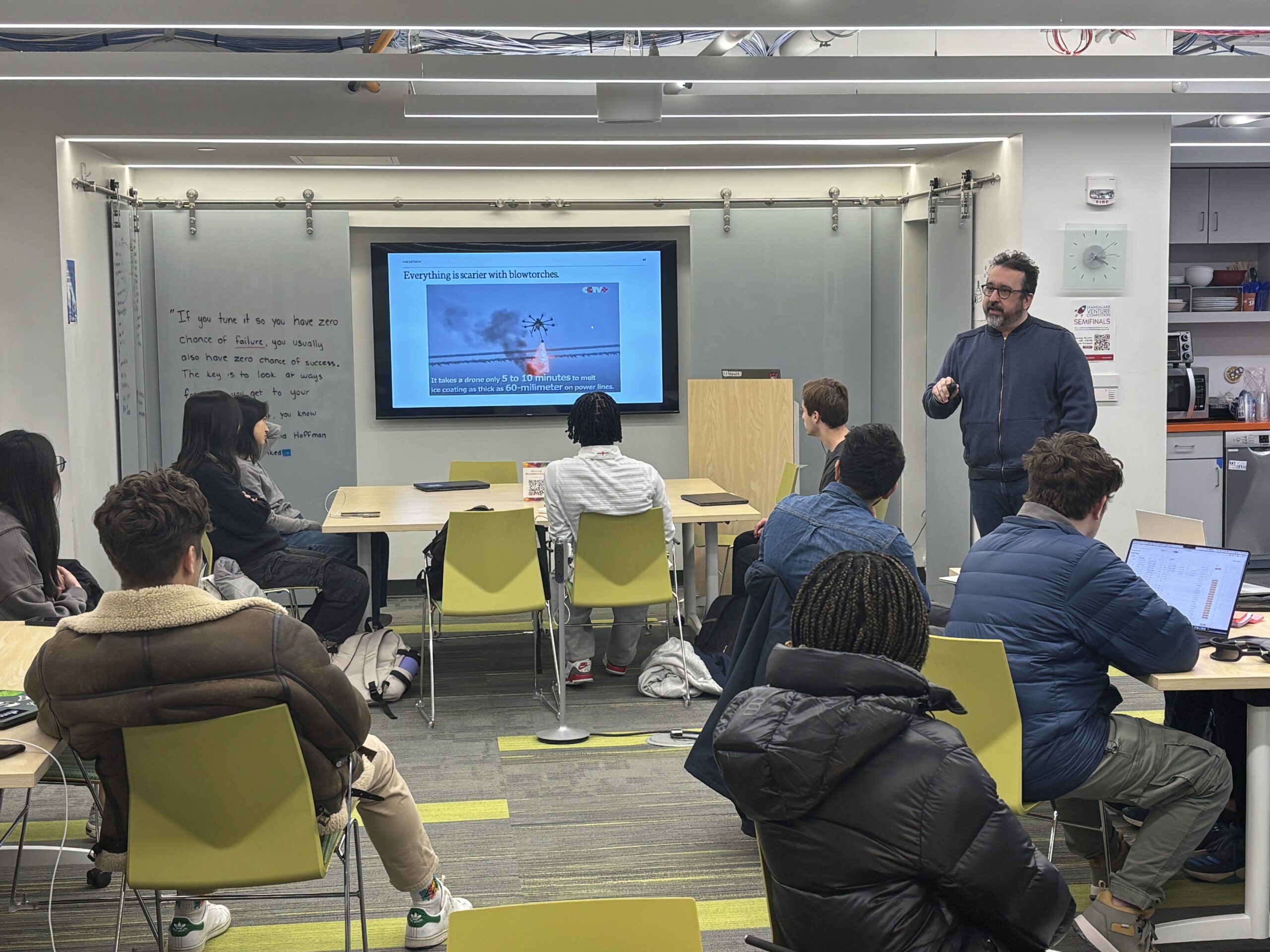 This wasn’t your typical hackathon. No squinting at screens filled with code. No existential crises over missing semicolons. (HA!) Just brilliant minds tackling real-world problems using no-code platforms. Associate Director Adam Wilson welcomed the teams to the Center on Friday evening with a thought exercise to spark creativity and a reminder to students that solutions are everywhere and to look at their problems from every angle. The energy was palpable as students broke off into teams to begin brainstorming.